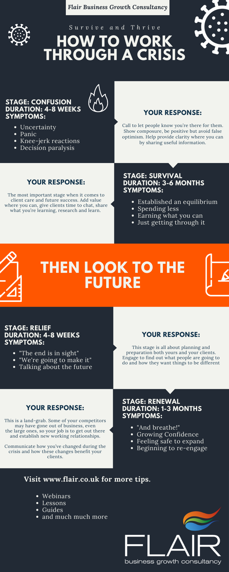 I’m keeping it high-level to make it easier to absorb. However, you’ll note that the Survival stage is crucial to your future success. So, we’ve prepared an in-depth study of how best to behave and interact with your clients to maximise the benefits you can receive during this stage – Extreme Client Care – Helping people through the crisis and setting yourself apart